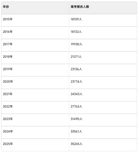 根据往年高考报名数据统计,十堰市高考报名人数自2017年触底反弹后持续攀升,实现“九连增”:2017年报名人数为19930人,2024年增至33561人,2025年再增1704人,总人数达35265人,创历史新高。