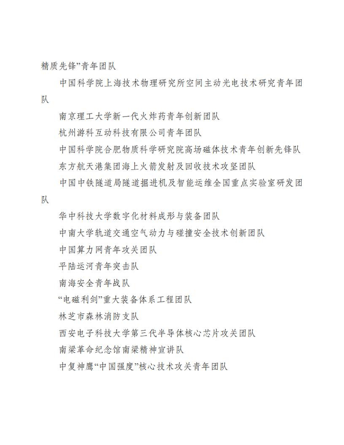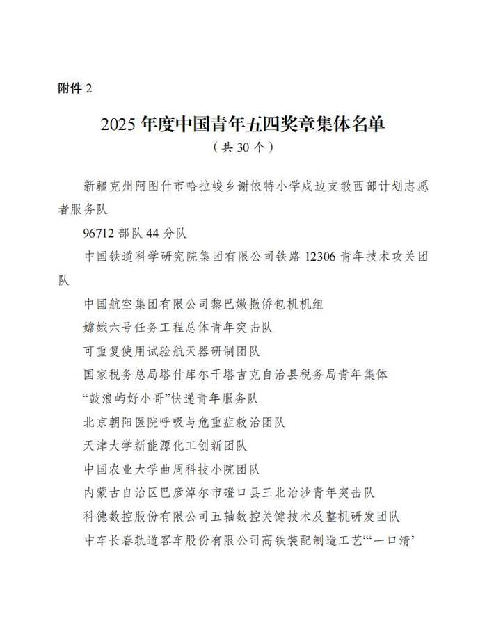 授予新疆克州阿图什市哈拉峻乡谢依特小学戍边支教西部计划志愿者服务队、96712部队44分队、中国铁道科学研究院集团有限公司铁路12306青年技术攻关团队等30个青年集体2025年度中国青年五四奖章集体;
