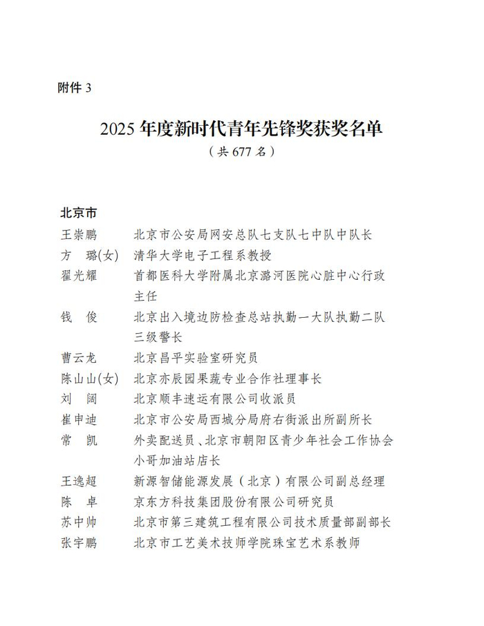 授予王崇鹏、方璐、翟光耀等677名同志2025年度新时代青年先锋奖。