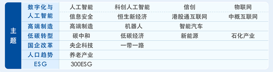 分别是:数字化与人工智能、高端制造、低碳转型、国企改革、人口趋势、ESG。并将紧跟市场发展与主题演化,持续优化整理分类。