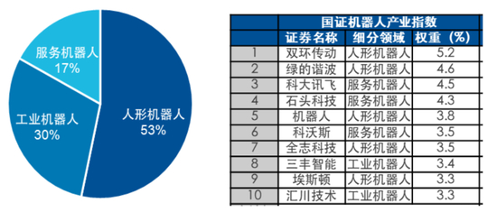 2、指数中人形机器人相关的权重占比,由38%显著提升至53%,另有30%和17%的权重分别为工业机器人和服务机器人。