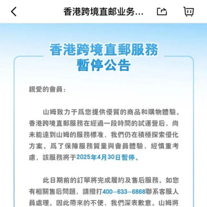 近日,山姆App发布最新公告:深圳山姆会员商店将于4月30日取消香港跨境直邮服务。