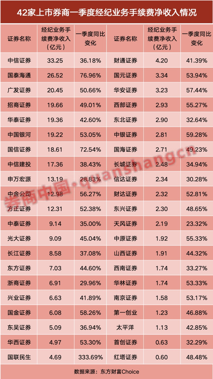 经纪业务一季度表现则全面向好。据券商中国记者统计,今年42家上市券商的经纪业务手续费净收入均实现增长,增幅的中位值达到48%。