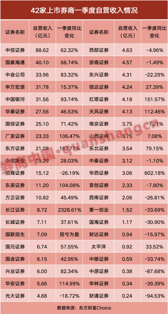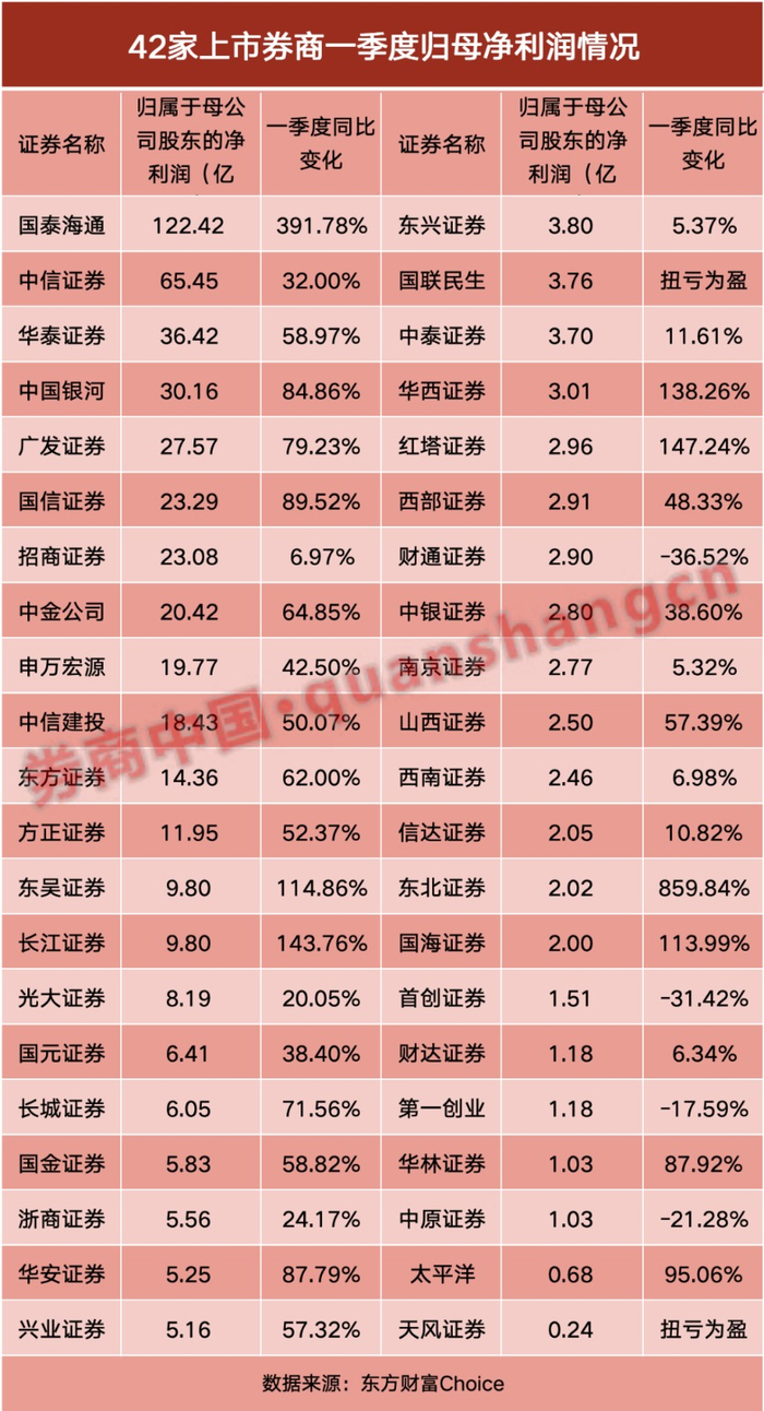 42家券商一季报发榜!7家净利润翻倍 自营最牛暴增23倍 经纪全面“高歌”