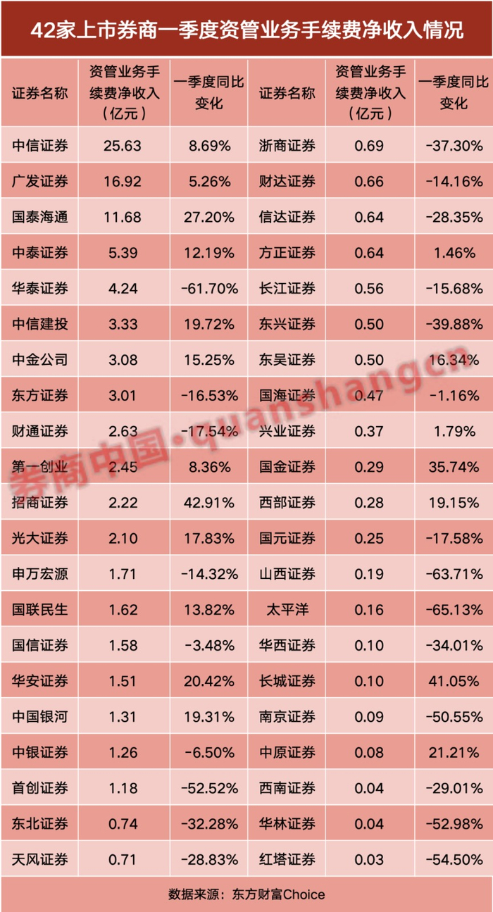 共有3家券商一季度资管手续费净收入超过10亿元。具体来看,中信证券以25.63亿元排名第一,同比增长8.69%。广发证券的资管表现优于合并后的国泰海通,前者资管手续费净收入为16.92亿元,同比增长5.26%;后者为11.68亿元,同比增长27.2%。