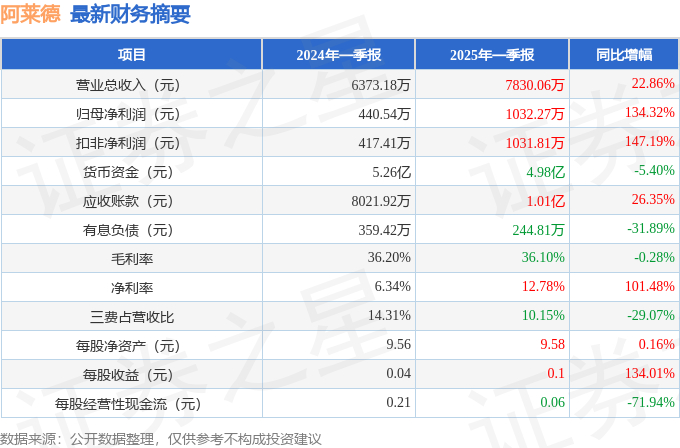 据证券之星公开数据整理,近期阿莱德(301419)发布2025年一季报。截至本报告期末,公司营业总收入7830.06万元,同比上升22.86%,归母净利润1032.27万元,同比上升134.32%。按单季度数据看,第一季度营业总收入7830.06万元,同比上升22.86%,第一季度归母净利润1032.27万元,同比上升134.32%。本报告期阿莱德公司应收账款体量较大,当期应收账款占最新年报归母净利润比达221.39%。
