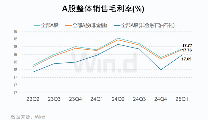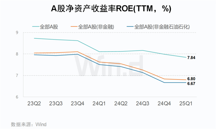 2025年一季度,A股销售毛利率较2024年全年水平小幅回升,全部A股、非金融板块及剔除石油石化后分别为17.77%、17.76%、17.69%;净资产收益率(ROE)延续下行趋势,全部A股滚动值较2024年下降0.15个百分点至7.84%,非金融板块为6.80%,剔除石油石化后为6.67%。整体呈现“毛利边际改善、盈利能力承压”的分化特征。