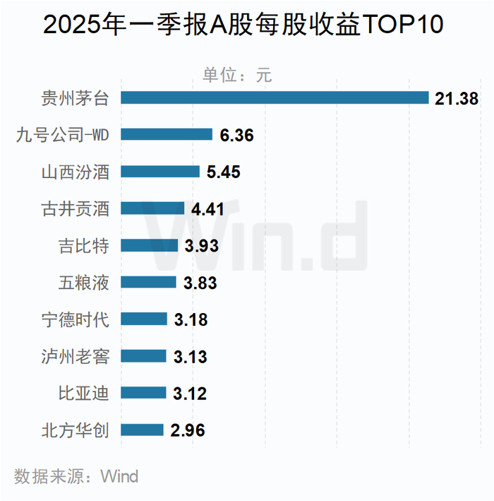 每股盈利方面,第一季度贵州茅台以21.38元的每股收益稳居榜首。