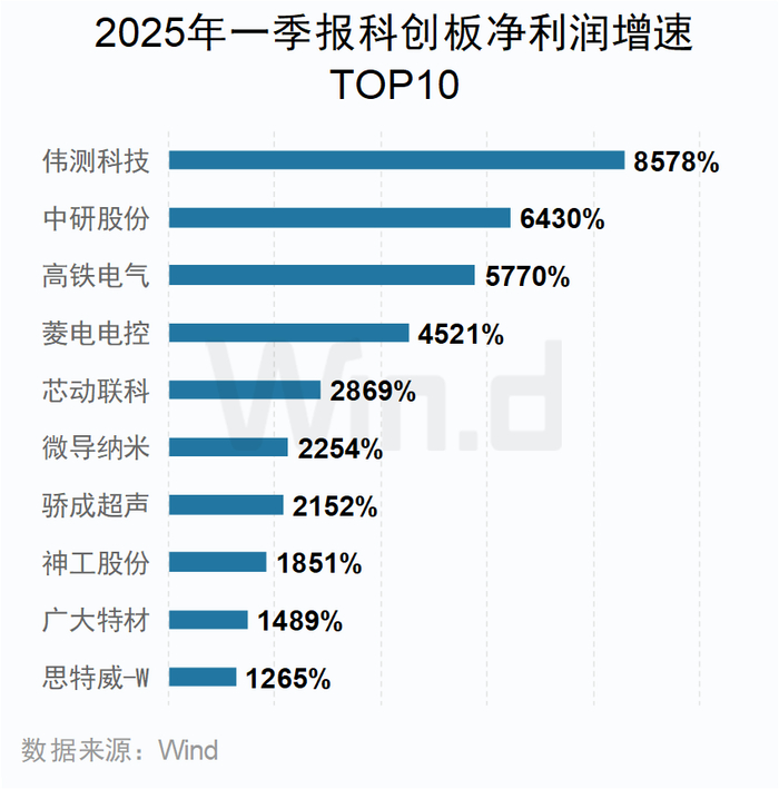 科创板方面,前10名净利润增速均超过10倍,伟测科技净利润增速超过85倍位居第一。