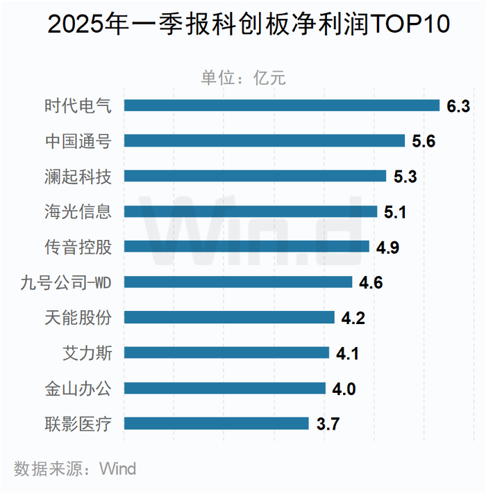 科创板方面,盈利位居前十的主要来自能源和半导体公司。时代电气以6.3亿元的净利润位居首位。