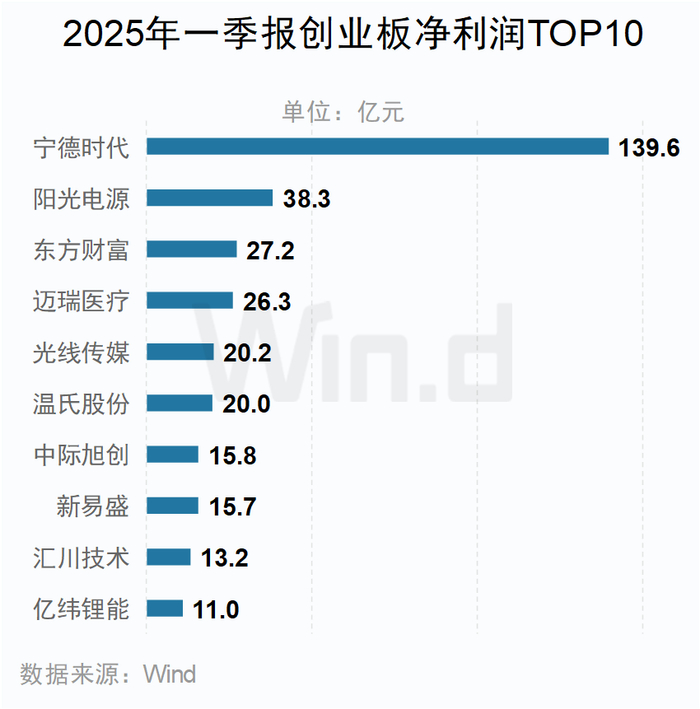 创业板方面,宁德时代以139.6亿元的净利润位居第一。
