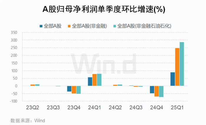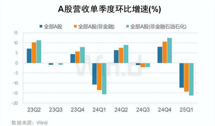 2025年一季度,A股营收环比2024年第四季度下滑12.4%(非金融板块下滑14.3%),归母净利润环比增长89.6%(非金融板块增长248.2%),收入承压与利润高增的结构性分化显著。