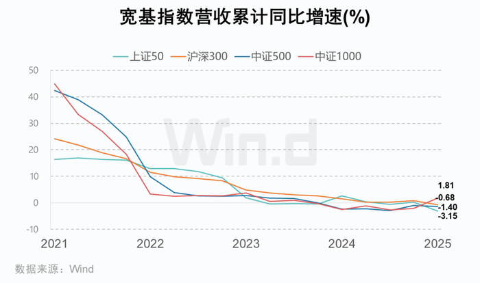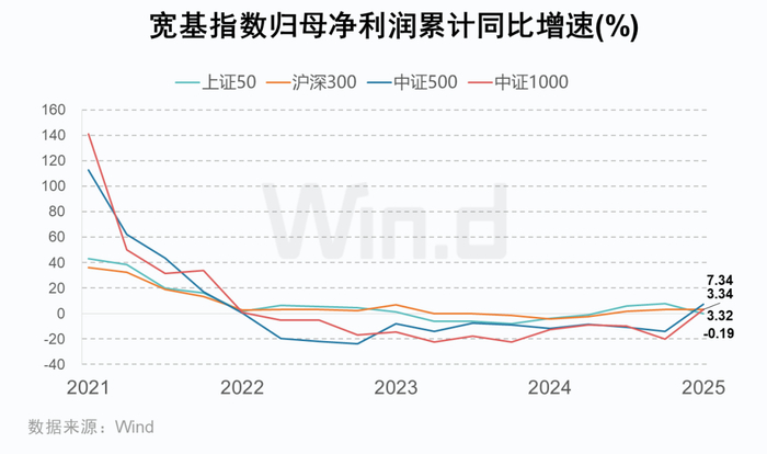 2025年一季度,A股宽基指数业绩分化延续。中证1000营收同比增1.81%,上证50、沪深300、中证500分别降3.15%、0.68%、1.40%;利润端中证500增7.34%、中证1000增3.34%,上证50降0.19%、沪深300增3.32%,中小盘盈利弹性主导市场结构切换。