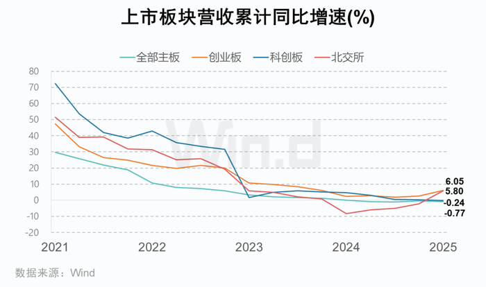 2025年一季度,A股主要板块业绩数据分化明显。主板营收增速-0.77%,科创板-0.24%,创业板6.05%,北交所5.80%;归母净利润增速主板3.84%,创业板15.40%,科创板-63.04%,北交所-7.65%。