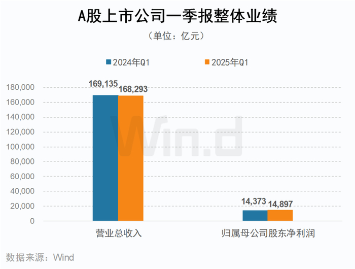 A股上市公司一季报披露收官。2025年一季度,A股上市公司业绩呈现“营收承压、利润改善”格局。Wind数据显示,5399家披露一季报的企业合计营收16.83万亿元,同比微降0.38%;归母净利润1.49万亿元,同比增长3.47%,较2024年四季度回升18.7个百分点,盈利修复动能逐步释放。