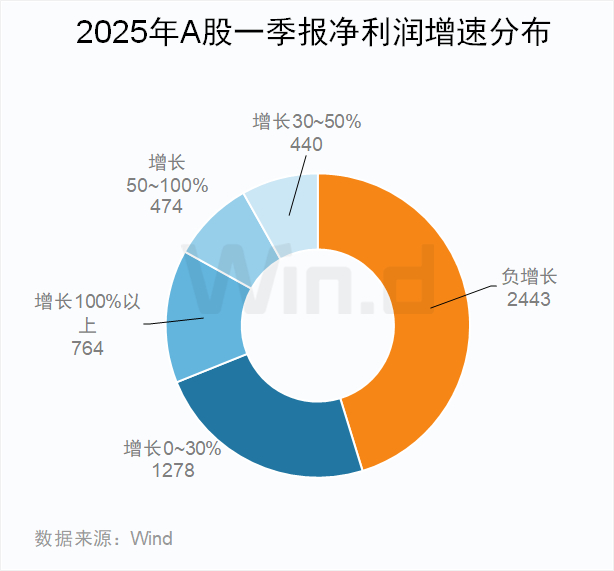 2025年一季度,A股上市公司业绩呈现分化态势。全市场共有4078家实现盈利,占上市公司总数的76%。从盈利增长结构看,2956家(占比55%)企业归母净利润实现正增长,其中:764家净利润增幅超100%(占比14%),474家增幅介于50%-100%(占比9%),1718家增幅低于50%(占比32%)。此外,2443家公司净利润呈现负增长局面。