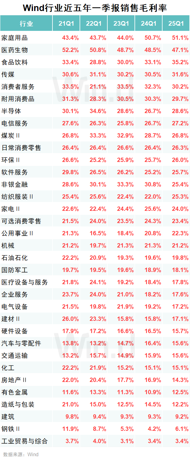 2025年一季度,食品饮料、家庭用品毛利率稳步提升,半导体、软件服务低位企稳,医药生物、家电波动收窄韧性凸显,房地产近五年回落显著,消费与科技板块定价能力优于周期行业。