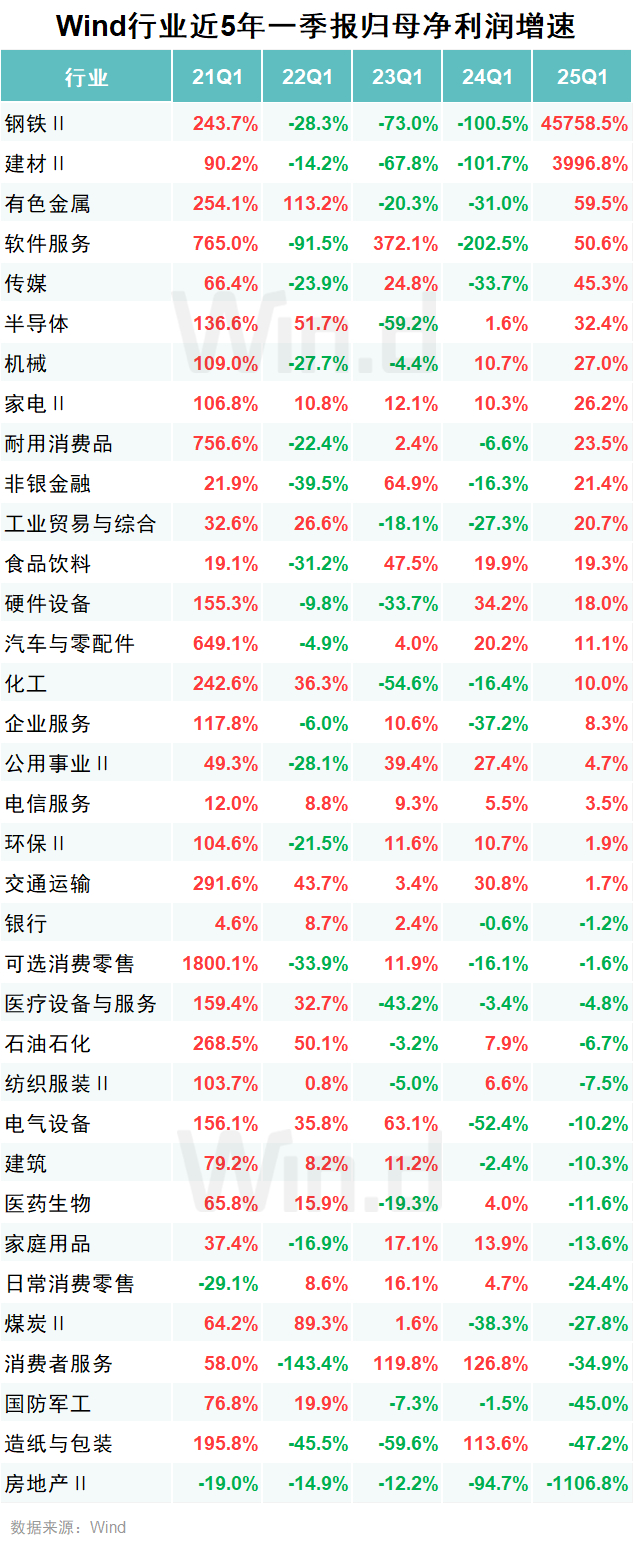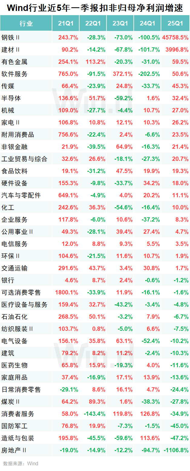 2025年一季度,钢铁、建材扣非归母净利润同比大幅提升,结束此前下滑趋势,有色金属、软件服务增速超50%,传媒行业扣非净利增速创近五年单季度新高。新旧动能转换背景下,周期板块剧烈波动与科技消费温和修复并存。