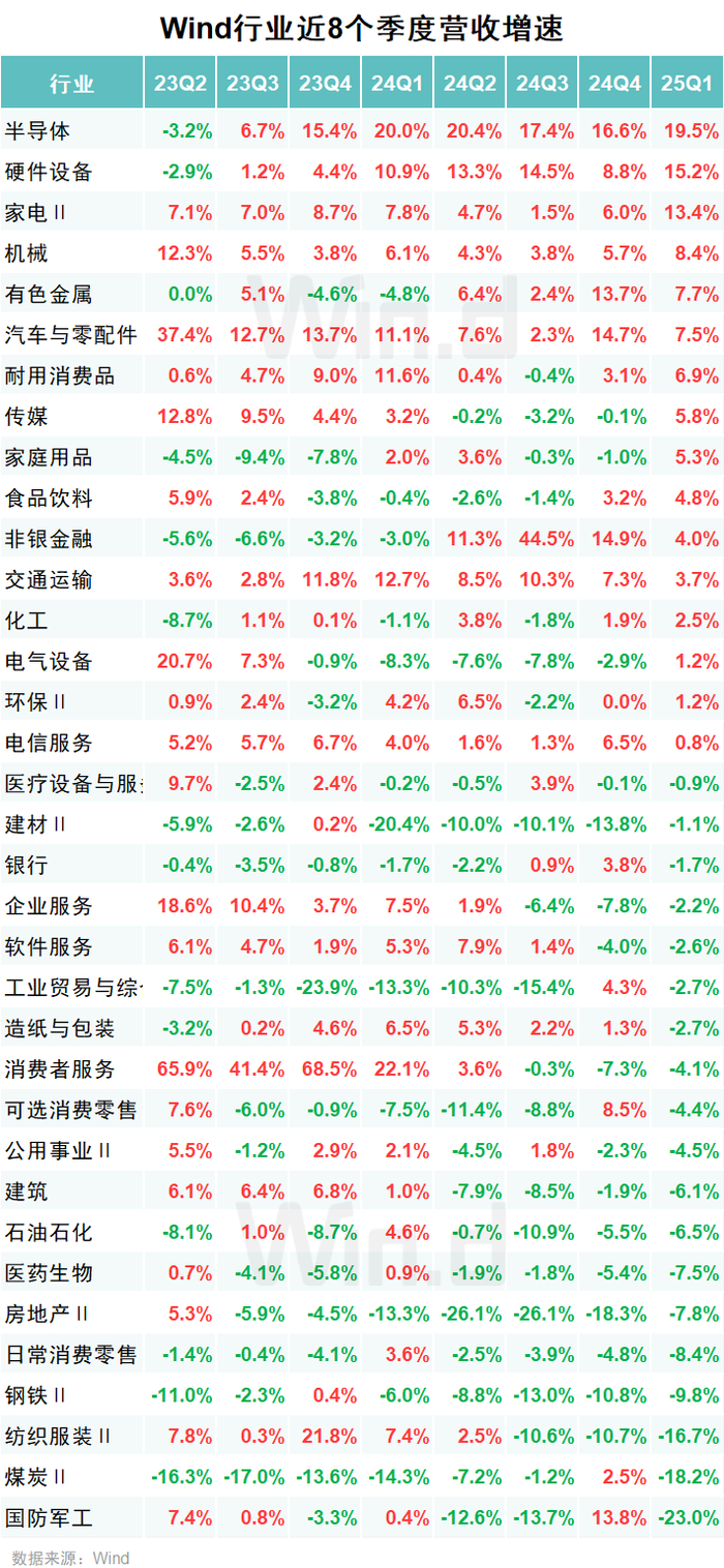 2025年一季度,A股行业营收增速呈结构性分化:半导体(19.5%)、硬件设备(15.2%)、家电(13.4%)维持高增,国防军工(-23.0%)、煤炭(-18.2%)、纺织服装(-16.7%)同比降幅超15%;历史对比显示,半导体连续两年增速超15%,家电、机械(8.4%)较2024年显著回升,国防军工、煤炭跌至近五年最低水平,新旧动能转换提速。
