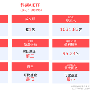 从收益能力看,截至2025年4月29日,科创AIETF自成立以来,最高单月回报为15.59%,最长连涨月数为2个月,最长连涨涨幅为26.17%,上涨月份平均收益率为15.59%,历史持有3个月盈利概率为95.24%。