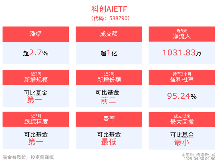 跟踪精度方面,截至2025年4月29日,科创AIETF近3月跟踪误差为0.016%,在可比基金中跟踪精度最高。