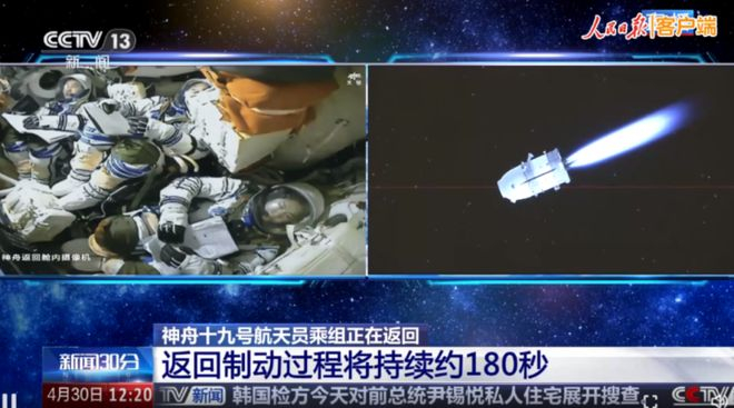 神舟十九号载人飞船与空间站组合体成功分离,今天返回东风着陆场。航天员蔡旭哲、宋令东、王浩泽踏上回家之路。