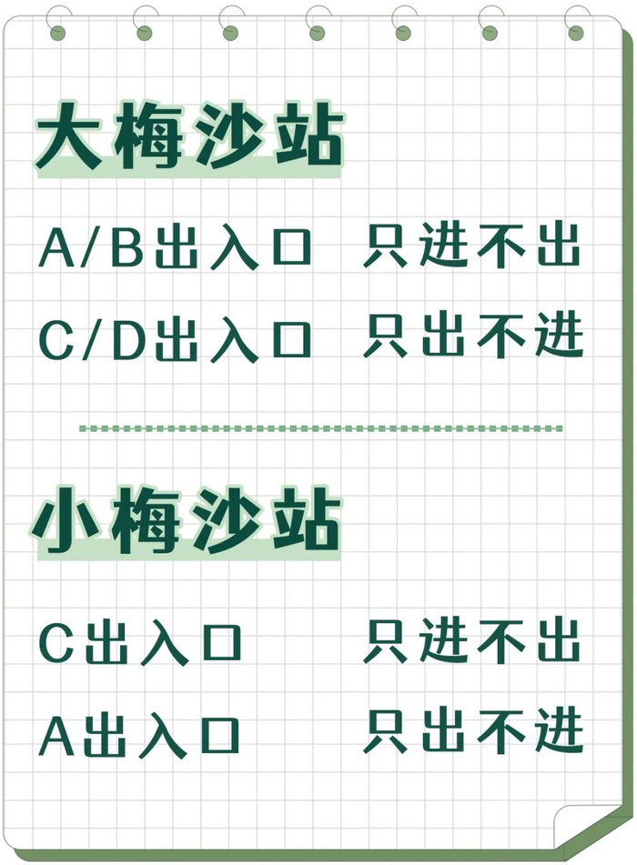 车站出入口单向通行:为避免客流交叉导致通行效率降低,大、小梅沙站将视情况启动出入口单向通行客流疏导措施。
