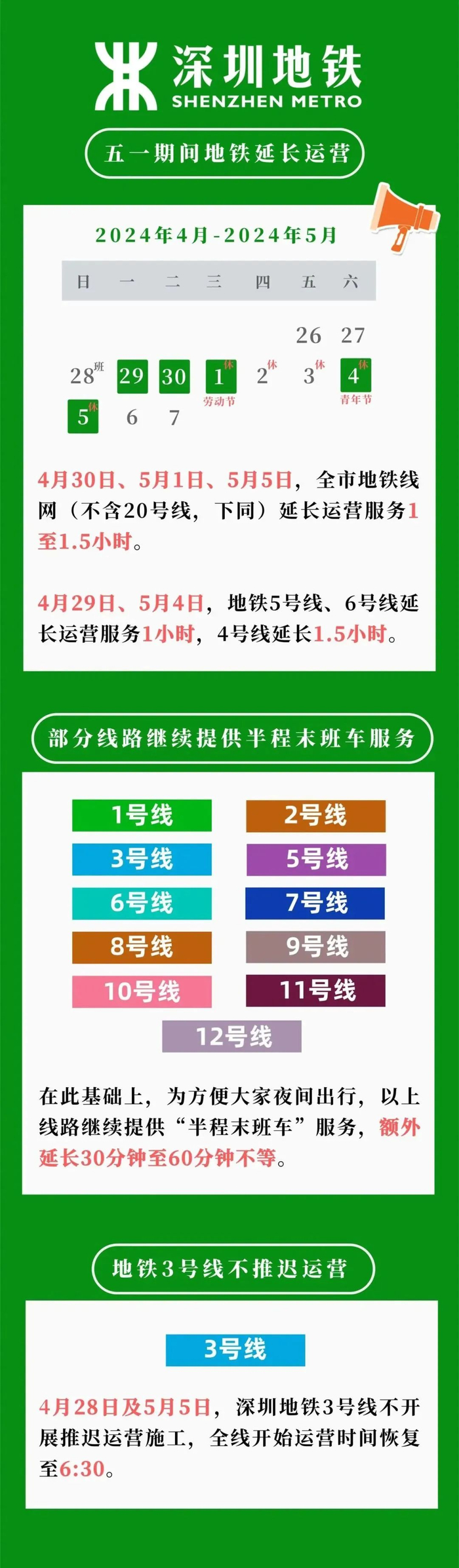 4月30日至5月4日期间,3号线运营服务时间无调整。