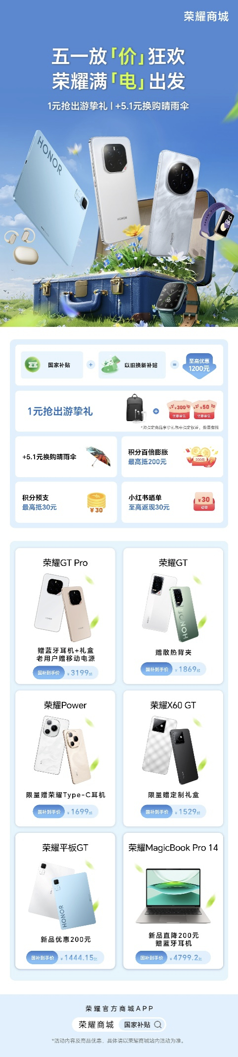 其中,荣耀Power内置8000mAh市场最大容量电池,彻底解决五一出行中的电池焦虑,指导价1999元起,国补后仅1699.15元起。