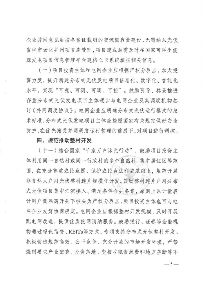 支持户用光伏整村连片规模化开发(以自然村或行政村为单位),允许集中汇流接入与合并备案,明确产权分界规则,配套电网改造与金融专项支持(绿色信贷、REITs等),严禁地方强制产业配套或变相收费,增加不合理投资成本。