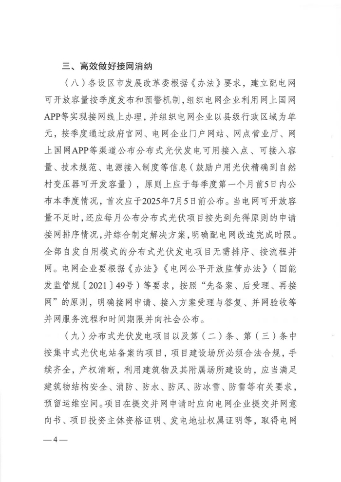 建立季度可开放容量发布及预警机制(首次于2025年7月5日前公布),电网企业按“先备案后受理”原则提供线上接网服务,容量不足时按“先到先得”排序并限期完成配电网改造;项目需提交权属证明、满足建筑安全标准,鼓励数字化升级并与电网签订《并网调度协议》。