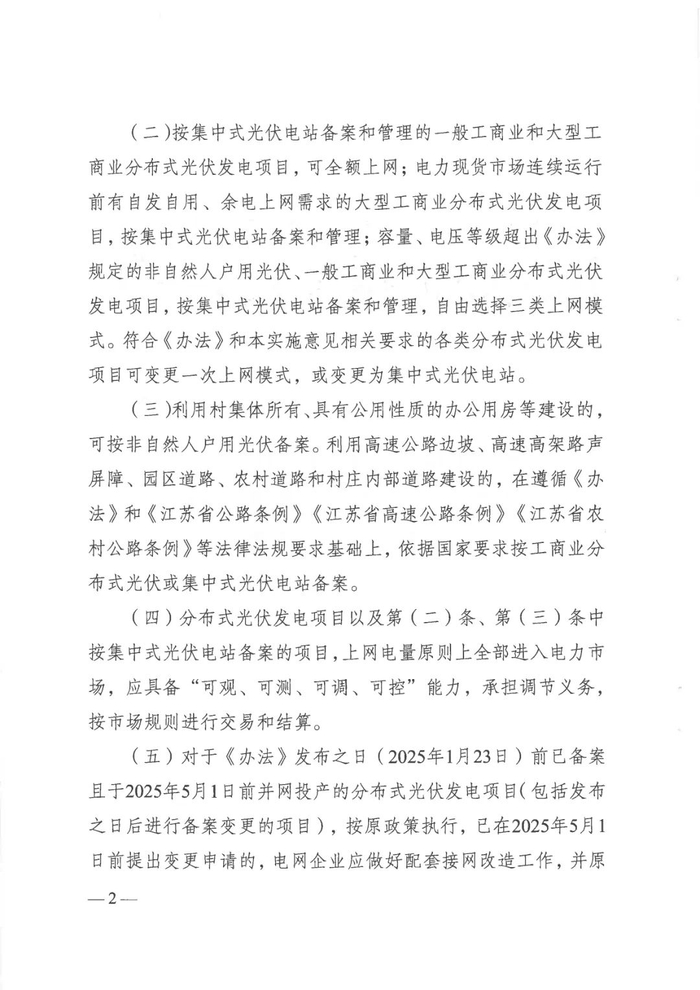4月29日,江苏省发展改革委与江苏能源监管办联合印发《关于贯彻落实〈分布式光伏发电开发建设管理办法〉的实施意见》(苏发改规发〔2025〕2号),围绕“上网模式、备案管理、接网消纳、整村开发、安全管理”五大维度推出创新举措,大力度推动全省分布式光伏科学布局、规范发展,全面破解分布式光伏发展痛点,为行业注入强劲动能。新政将于即日起施行,有效期至2030年1月23日。