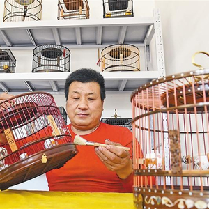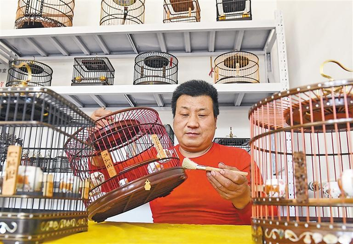 图为在旺村镇七女村,市级非物质文化遗产传统鸟笼制作技艺代表性传承人蔡永涛正在管护红木鸟笼。