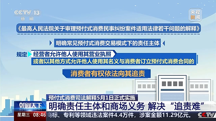 司法解释明确了常见预付式消费交易模式下的责任主体,规定:经营者允许他人使用其营业执照,或者以其他方式允许他人使用其名义与消费者订立预付式消费合同的,消费者有权依法向其追责。