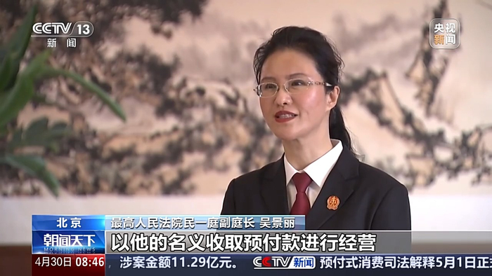 最高人民法院民一庭副庭长吴景丽:比如说甲经营者明知乙经营者以他的名义收取预付款进行经营,这种情况下,如果乙经营者跑路了,消费者就可以要求甲经营者承担责任。再比如加盟店发卡,向消费者承诺总店将承担最终的兑付责任,总店默许这一行为,此时消费者可以向总店要求承担责任。