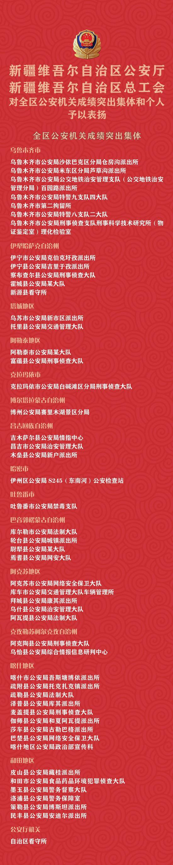 新疆50个集体100名个人获公安厅和总工会通报表扬