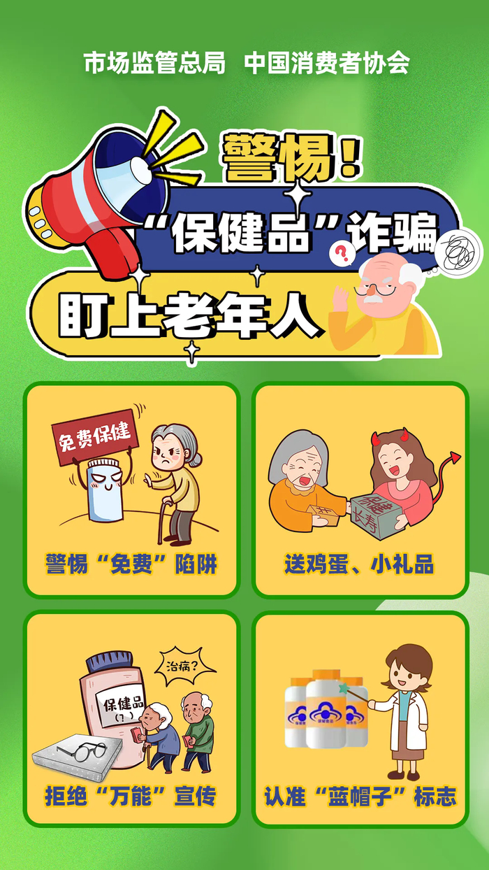 近期,市场监管总局和中国消费者协会联合发布防范“保健品”诈骗老年人消费提示,提醒老年消费者增强风险防范意识,远离诈骗陷阱。