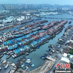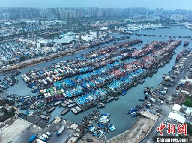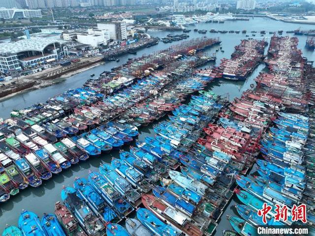 4月30日,广西北海侨港电建渔港,归港的渔船在港内整齐排列。据了解,2025年南海伏季休渔时间从5月1日12时开始至8月16日12时结束,为期三个半月,目前北海市数千艘应休渔船正陆续靠泊电建渔港、地角内港等锚地。(无人机照片)中新社记者 陈冠言 摄