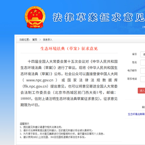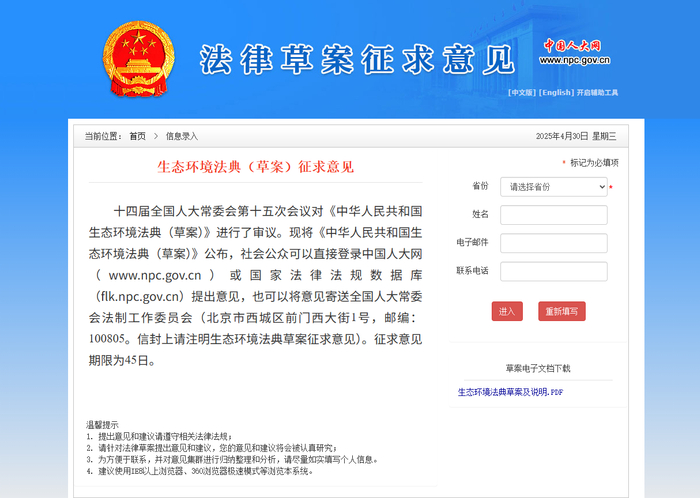 今日起,生态环境法典(草案)公开征求意见。征求意见时间为2025年4月30日至 2025月6月13日,期限为45日。社会公众可以直接登录中国人大网(www.npc.gov.cn)或国家法律法规数据库(flk.npc.gov.cn)提出意见,也可以将意见寄送全国人大常委会法制工作委员会(北京市西城区前门西大街1号,邮编:100805。信封上请注明生态环境法典草案征求意见)。