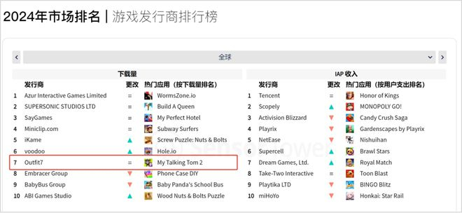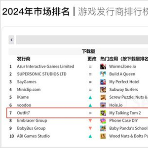 据全球移动数据分析公司SensorTower发布的《2025年移动市场报告》,2024年,“会说话的汤姆猫家族”IP系列游戏产品位列iOS及GooglePlay游戏综合下载榜全球第7,公司已连续15年入选游戏发行商Top10下载榜;同时,公司旗下三款产品入围全球生活风格游戏品类前4强,成为该细分品类中占比最大的IP产品。