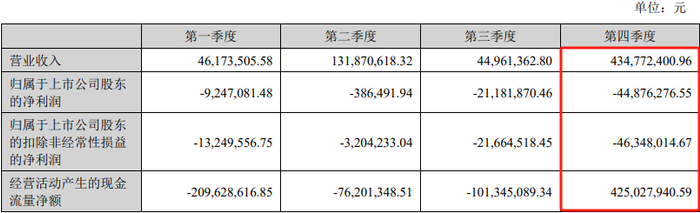 不过四季度,宏景科技营收和现金流已大幅向好。当季营收4.35亿元,经营活动产生的现金流量净额4.25亿元,转正。