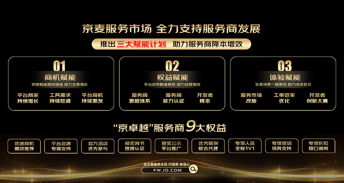 在本次大会上,京东还正式发布了“服务商赋能计划”,以商机赋能、权益赋能、体验赋能三大核心维度为着力点,为服务商提供精准商机匹配、九大权益支持、激活生意场景等全方位的服务支撑。