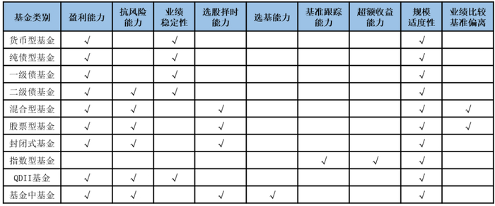 针对不同类型的基金选择不同的评价,组成综合的指标体系:风险较低的货币市场基金、纯债基金和一级债基金主要考察基金的盈利能力和业绩稳定性;而二级债基金由于可以进行部分的二级市场投资,则要在盈利能力和业绩稳定性的基础上进一步考查其抗风险能力;权益类资产基金如股票、混合等类型基金,可以主动进行资产配置,因此在盈利能力、抗风险能力两方面之外,着重考察基金经理的选股择时能力;指数型基金,操作类型属于被动投资运作,因此重点考察基金的指数复制与跟踪能力;QDII基金考查其盈利能力、抗风险能力和业绩稳定性。另外,各类型均会考察基金公司在该类型下在管产品的规模适度性,对于混合型和股票型产品的管理,还会额外考察基金公司旗下产品的业绩比较基准偏离。