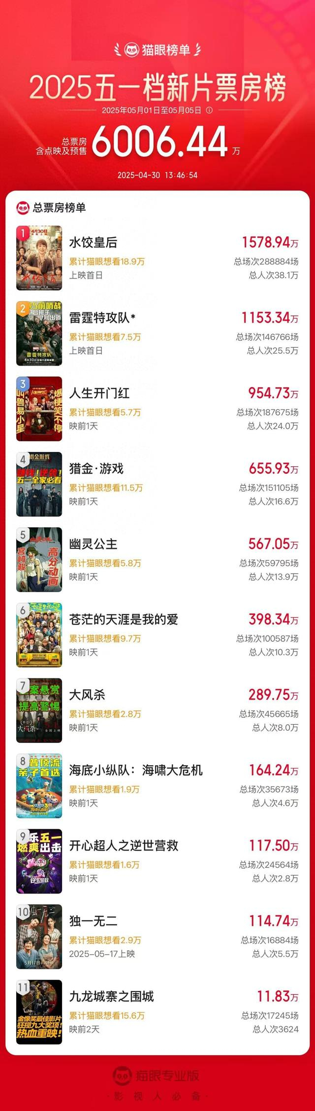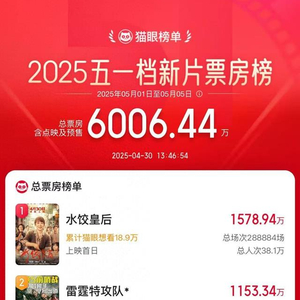据网络平台数据,截至4月30日13时46分,2025年五一档总票房(含点映及预售)破6000万,《水饺皇后》《雷霆特攻队*》《人生开门红》分列新片票房榜前三位。