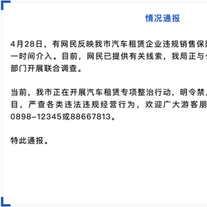 三亚市交通运输局通报,4月28日,有网民反映三亚市汽车租赁企业违规销售保险等问题,三亚市交通运输局获悉情况后第一时间介入。目前,网民已提供有关线索,该局正与公安、综合执法、市场监督等部门开展联合调查。