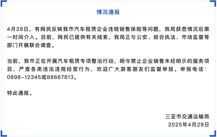 网民反映三亚汽车租赁企业违规销售保险,多部门开展联合调查