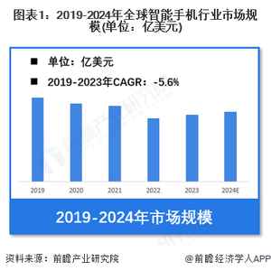 根据《GB/T 42002-2022 跨境电子商务交易类产品信息多语种描述智能手机》的定义,智能手机是指具有独立的操作系统和运行空间,可以由用户自行安装第三方服务商提供的程序,并可以通过移动通信网络来实现无线网络接入的手机类型的总称。近年来全球智能手机行业逐渐饱和行业市场规模有所萎缩,2023年全球智能手机行业市场规模仅约5000亿美元,但近四年行业复合增速为-5.6%。初步估算,2024年全球智能手机行业市场规模将小幅回暖增长超过5300亿美元。