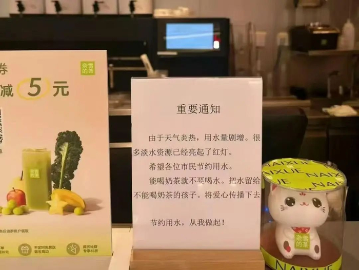 此外,图片显示,门店张贴的通知显示,“由于天气炎热,用水量剧增。很多淡水资源已经亮起了红灯。希望各位市民节约用水,能喝奶茶就不要喝水。把水留给不能喝奶茶的孩子,将爱心传播下去”。