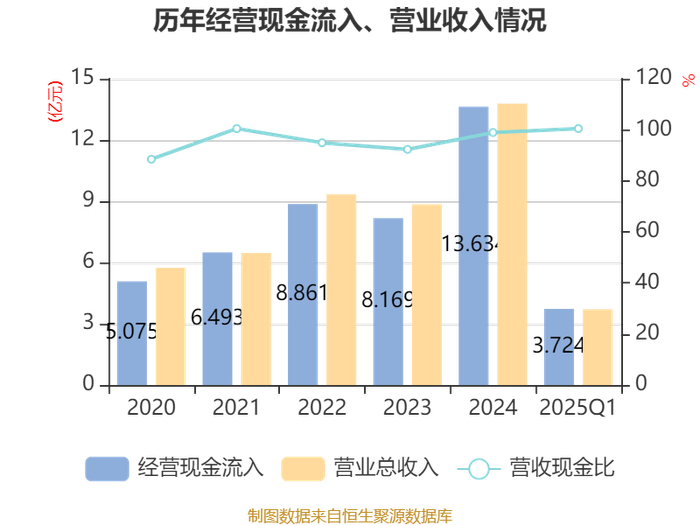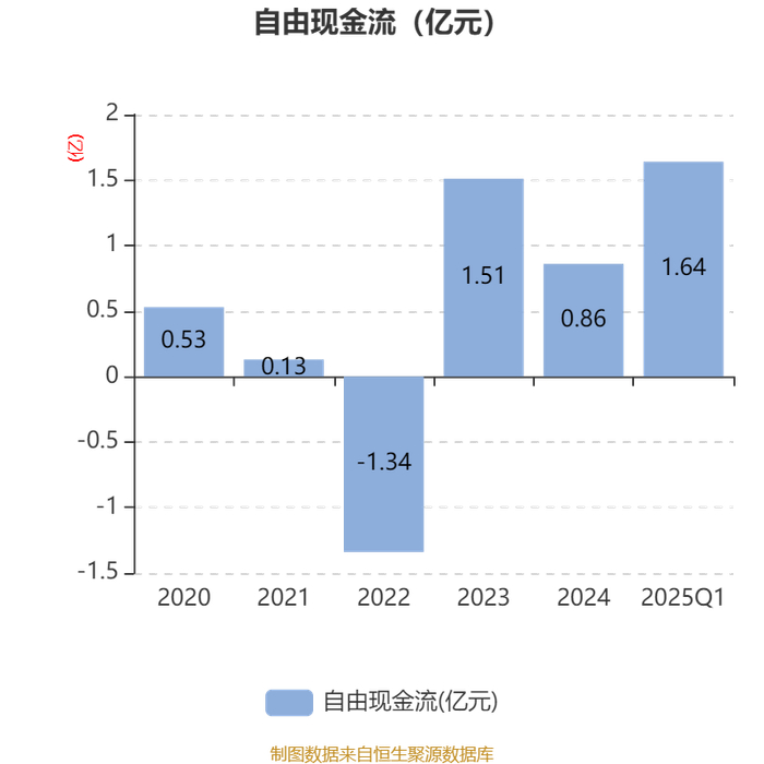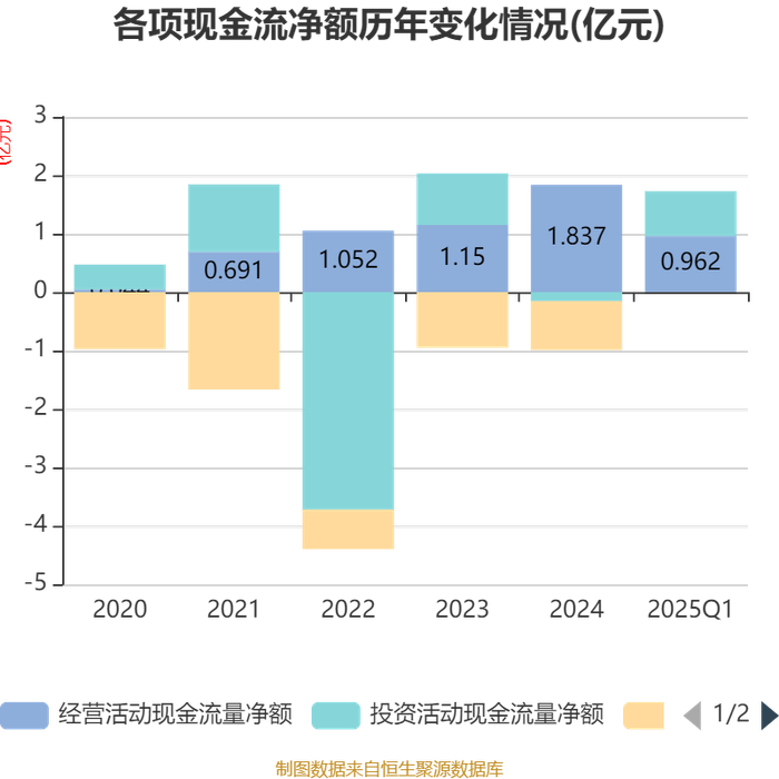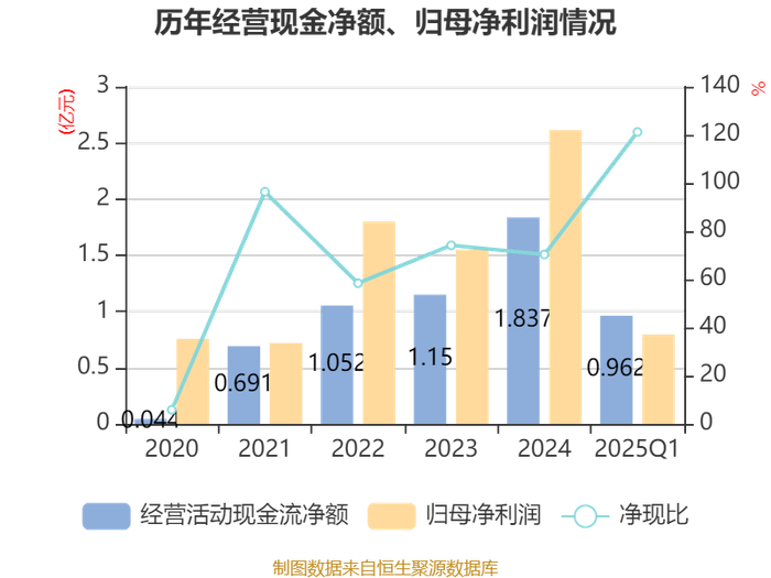 截至2025年一季度末,公司经营活动现金流净额为9617.84万元,同比增长117.85%;筹资活动现金流净额-14.21万元,同比减少3050.45万元;投资活动现金流净额7641.38万元,上年同期为3429.63万元。