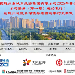 25随投01公司债:利率新低优化融资结构。2025年3月10日,天风证券主承销的随州市城市投资集团有限公司2025年面向专业投资者非公开发行公司债券(第一期)成功发行,募集资金总额4亿元,期限为5(3+2)年期,发行利率2.95%。本期债券票面利率创随州地区公司债券发行票面利率历史新低,发行获得了众多投资人的高度认可,各类投资机构积极参与申购,其中非银资金占比超过70%。此次债券成功发行,对随州市城市投资集团有限公司意义非凡:一方面,为发行人开辟了更为广阔的融资路径,有效优化了发行人的融资结构;另一方面,显著降低了发行人融资成本,减轻了财务负担。与此同时,随州城投在资本市场的品牌形象和市场影响力也得到进一步巩固与提升,为发行人未来的发展奠定了坚实基础。